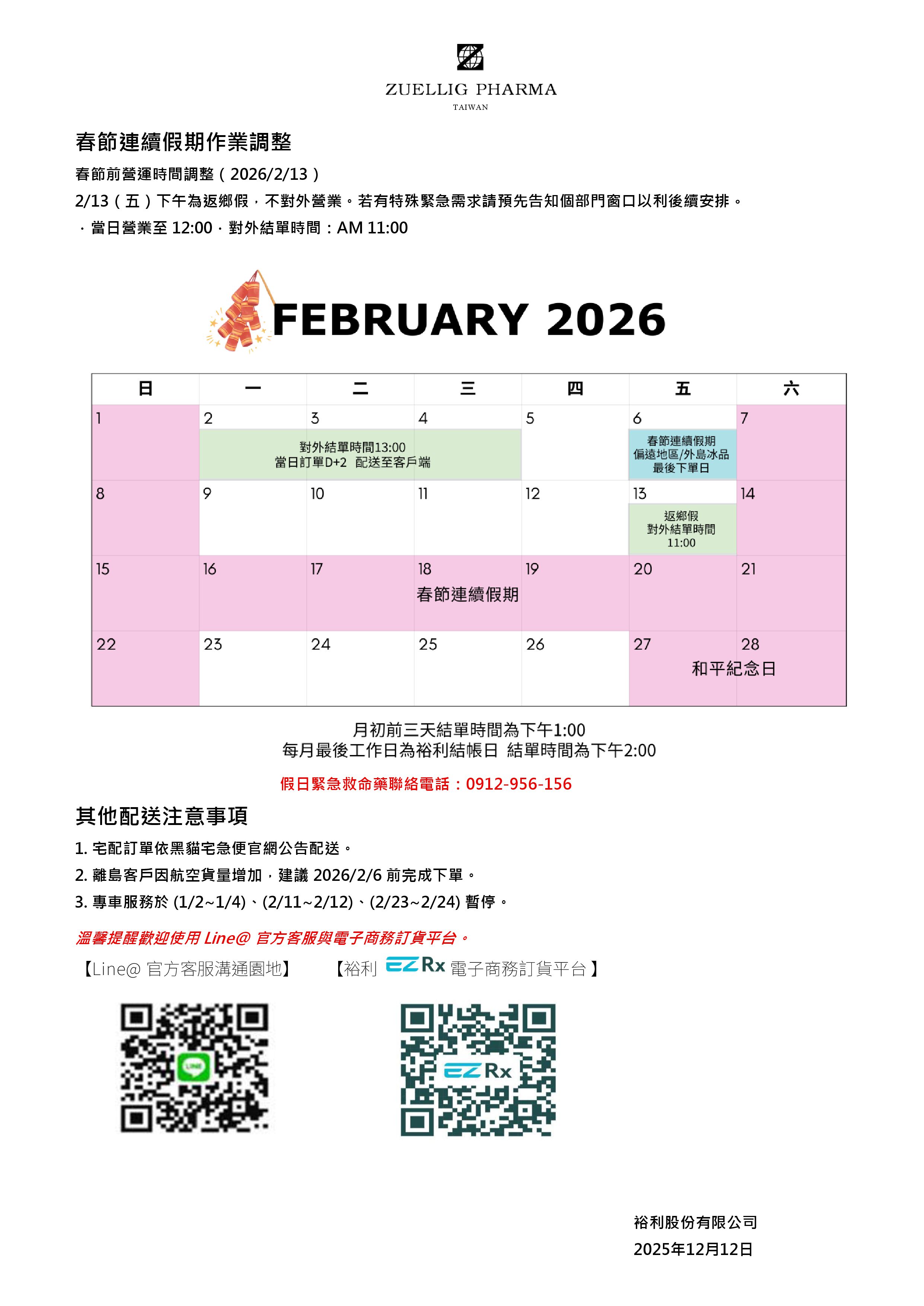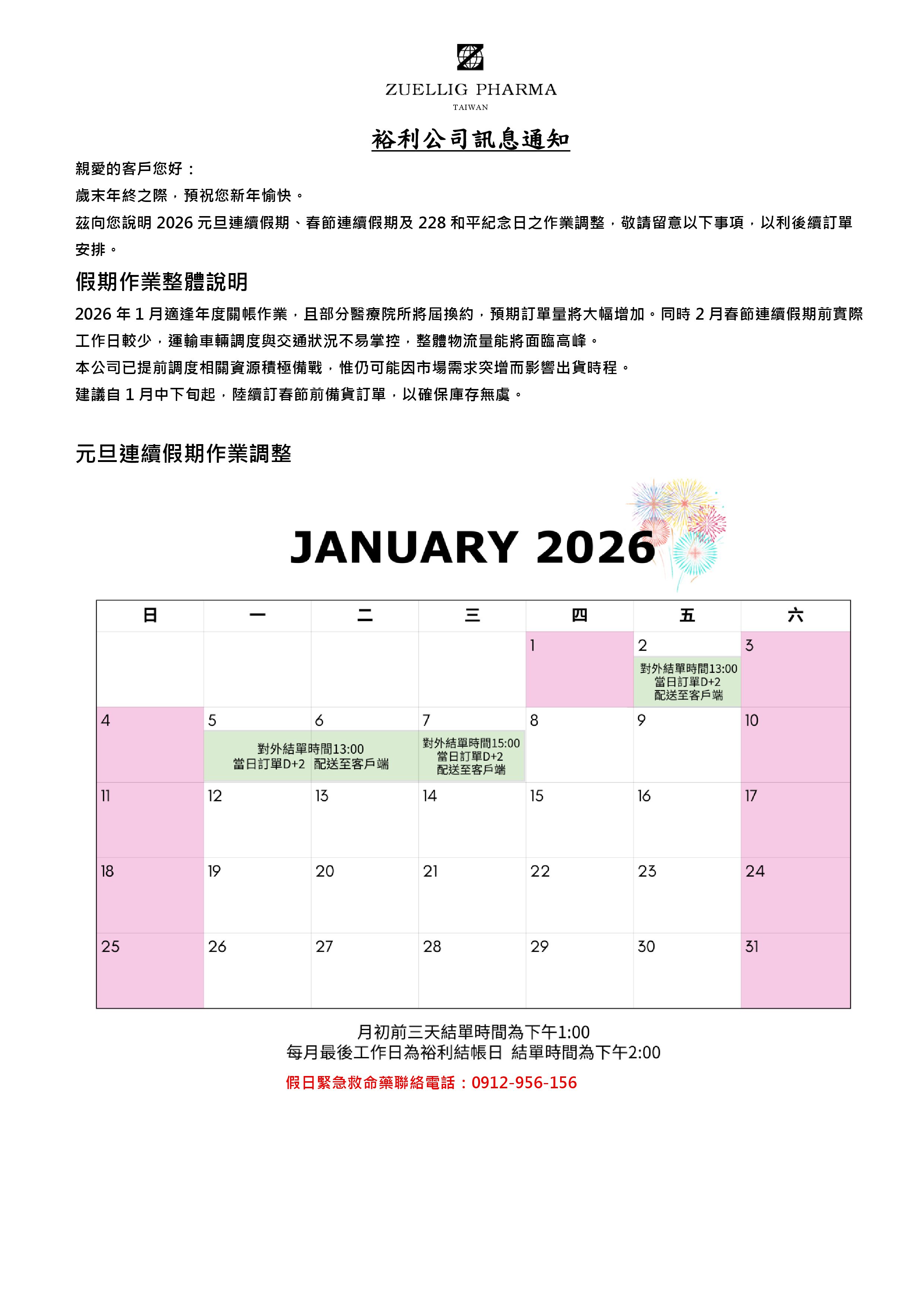 裕利公司訊息通知_ 2026 1-2 月連續假期通知函